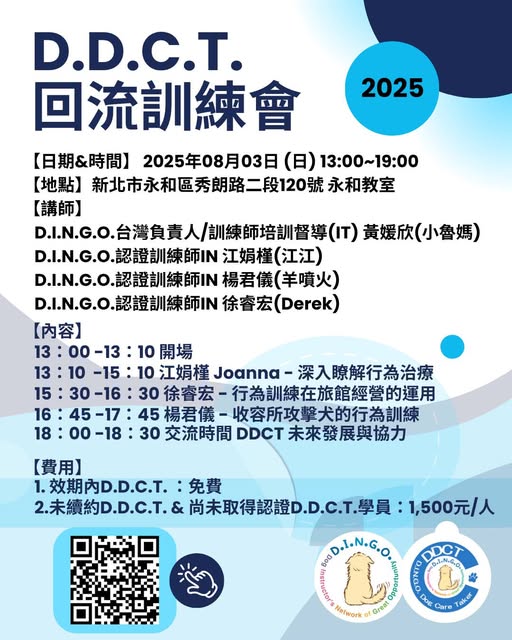 【2019年DDCT寵物照護管理士證照班-開放報名】 照護管理士(DDCT,D.I.N.G.O. DOG CARE TAKER) 提供以行為訓練為主要架構的專業知識, 適合想從事狗狗相關行業的人士進修並取得證照。 我們的DDCT在台灣各地從事保母、寵物...